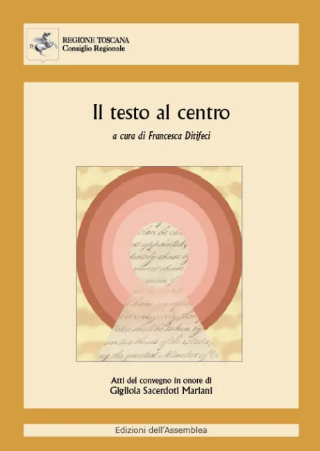 Il testo al centro : atti del convegno in onore di Gigliola Sacerdoti Mariani : Firenze, 15-16 aprile 2010 / a cura di Francesca Ditifeci. – Firenze : Consiglio regionale della Toscana, 2012. 1. Ditifeci, Francesca 2. Toscana. Consiglio regionale 3. Sacerdoti Mariani Gigliola. 418 Linguistica – Atti di congressi C.I.P. (Cataloguing in publishing) a cura della Biblioteca del Consiglio regionale della Toscana